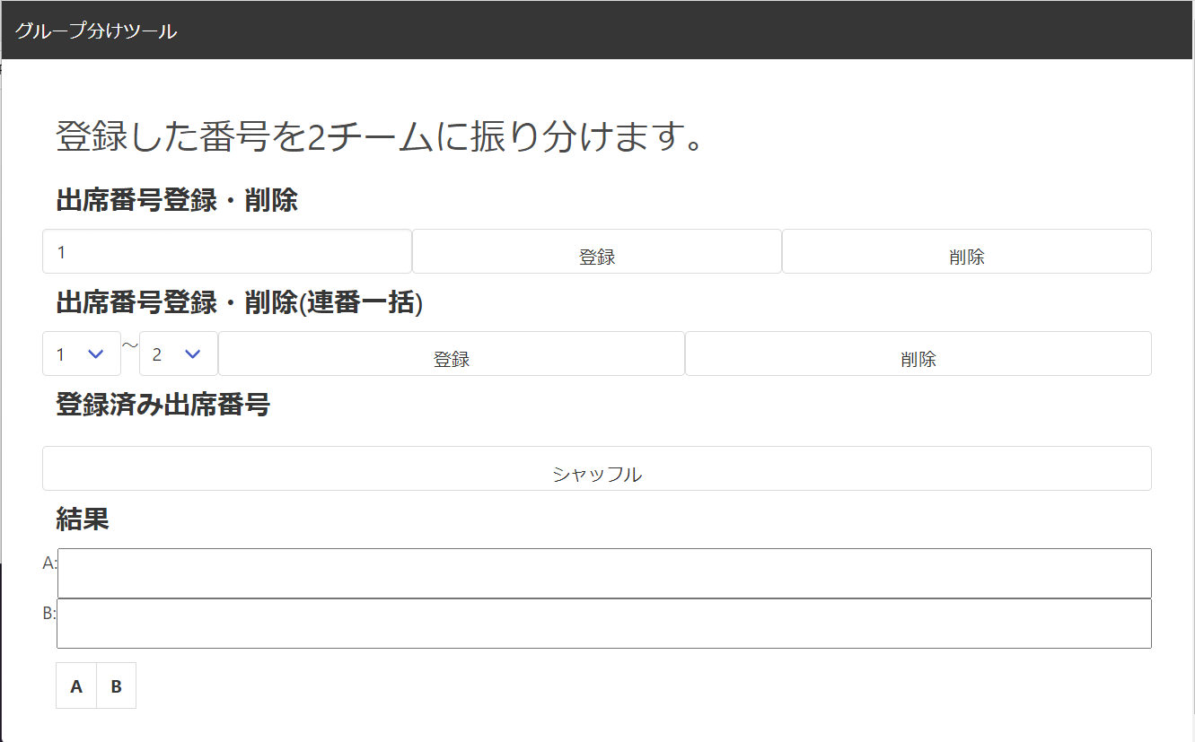 - 出席番号などを登録した2チームに振り分けます。連番で登録削除したりできます。