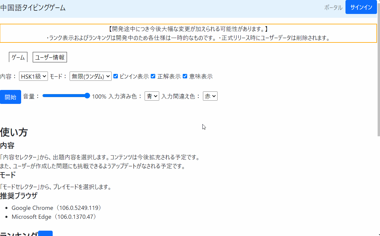 - 出された単語のピンインを打っていきます。声調も打つ必要があるのでそれも同時に覚えられます。声調はhskなどでも使用される普通话です。